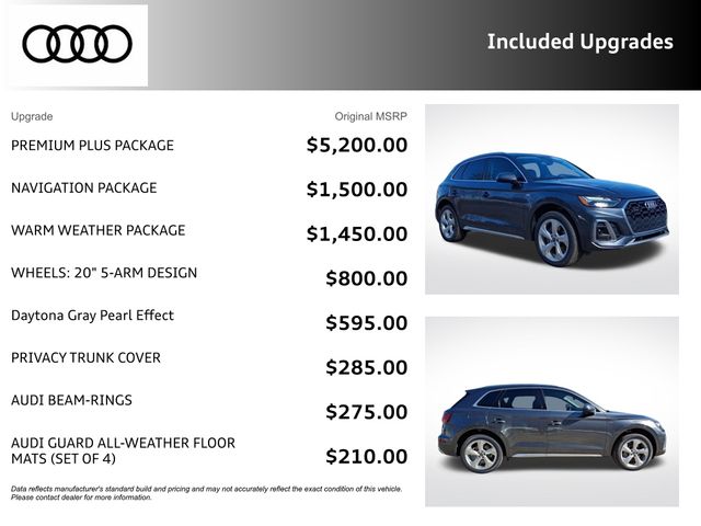 Certified. Daytona Gray Pearl Effect 2023 Audi Q5 45 S line Premium Plus quattro quattro 7-Speed Automatic S tronic 2.0L Turbocharged RECENT HOFFMAN TRADE, CLEAN CAR FAX...NO ACCIDENTS, AUDI CERTIFIED, SERVICE RECORDS AVAILABLE, ONE OWNER, NAVIGATION GPS NAV, SUNROOF MOONROOF, REMAINDER OF FACTORY WARRANTY, NEW TIRES, 6 MONTH OR 6,000 POWERTRAIN WARRANTY, ABS brakes, Alloy wheels, Audi Active Lane Assist, Audi Advanced Key, Audi Connect PLUS, Audi Virtual Cockpit Plus, Auto-Dimming Power Folding Exterior Mirrors, Bang & Olufsen Sound System w/3D Sound, Compass, Convenience Package, Driver Seat Memory, Electronic Stability Control, Front dual zone A/C, Hands-On Detection Steering Wheel, Heated door mirrors, Heated front seats, Heated Steering Wheel, Illuminated entry, Leatherette Covered Center Console & Door Armrests, Low tire pressure warning, Manual Rear Side Window Sunshades, MMI Navigation Plus, Navigation Package, Navigation System, Panoramic Sunroof, Power Adjustable Steering Column, Power Liftgate, Premium Plus Package, Remote keyless entry, SiriusXM w/360L, Top View Camera System, Traction control, Traffic Jam Assist, Ventilated Front Sport Seats w/4-Way Power Lumbar, Warm Weather Package, Wheels: 20" 5-Arm Design.