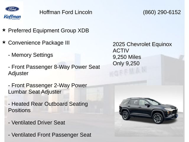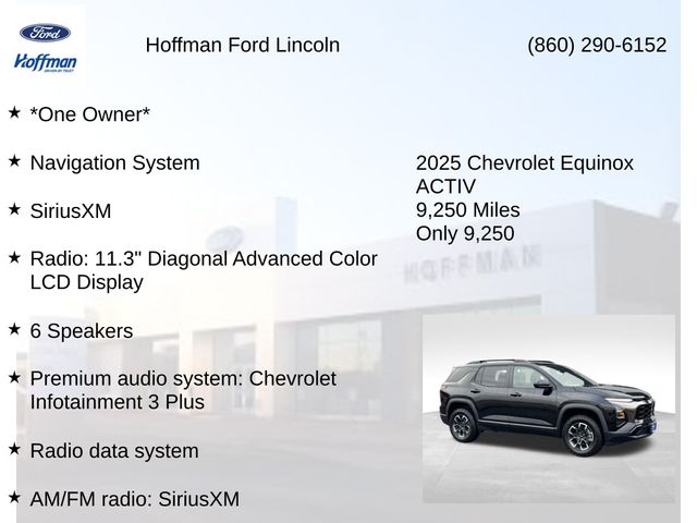 *One Owner*, Equinox ACTIV, FWD, Mosaic Black Metallic, 2-Way Power Driver Lumbar Control Seat Adjuster, 4-Wheel Disc Brakes, 6 Speakers, ABS brakes, Air Conditioning, AM/FM radio: SiriusXM, Auto High-beam Headlights, Automatic temperature control, Brake assist, Bumpers: body-color, Compass, Convenience Package III, Delay-off headlights, Driver 8-Way Power Seat Adjuster, Driver door bin, Driver vanity mirror, Dual front impact airbags, Dual front side impact airbags, Electronic Stability Control, Emergency communication system: OnStar and Chevrolet connected services capable, Four wheel independent suspension, Front anti-roll bar, Front Bucket Seats, Front Center Armrest, Front dual zone A/C, Front Passenger 2-Way Power Lumbar Seat Adjuster, Front Passenger 4-Way Manual Seat Adjuster, Front Passenger 8-Way Power Seat Adjuster, Front reading lights, Fully automatic headlights, Garage door transmitter, Heated door mirrors, Heated Driver & Front Passenger Seats, Heated front seats, Heated Rear Outboard Seating Positions, Heated steering wheel, Illuminated entry, Low tire pressure warning, Memory seat, Memory Settings, Navigation System, Occupant sensing airbag, Outside temperature display, Overhead airbag, Overhead console, Panic alarm, Passenger door bin, Passenger vanity mirror, Power door mirrors, Power driver seat, Power Liftgate, Power steering, Power windows, Preferred Equipment Group XDB, Premium audio system: Chevrolet Infotainment 3 Plus, Radio data system, Radio: 11.3" Diagonal Advanced Color LCD Display, Rain sensing wipers, Rear anti-roll bar, Rear reading lights, Rear seat center armrest, Rear window defroster, Rear window wiper, Remote keyless entry, Security system, SiriusXM, Speed control, Speed-sensing steering, Split folding rear seat, Spoiler, Steering wheel mounted audio controls, Sueded Microfiber Seat Trim, Tachometer, Telescoping steering wheel, Tilt steering wheel, Traction control, Trip computer, Universal Home Remote Non-Functional, Variably intermittent wipers, Ventilated Driver Seat, Ventilated Front Passenger Seat, Wheels: 17" Dark Android Machined-Face Aluminum.