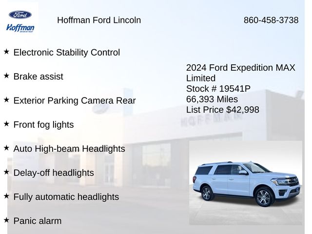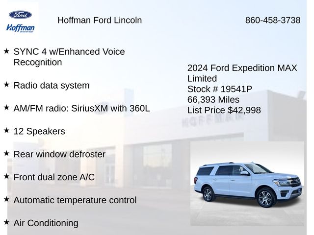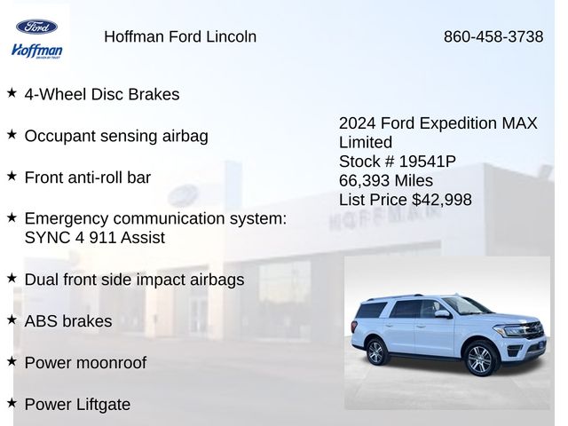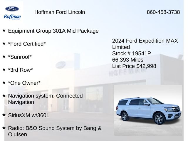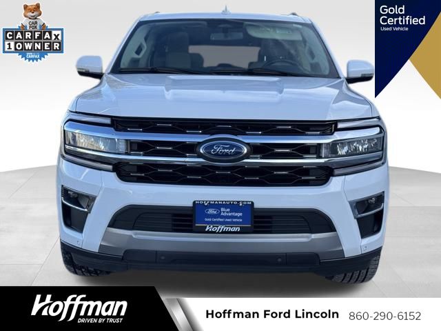 *Ford Certified*, *Sunroof*, *3rd Row*, *One Owner*, Expedition Max Limited, Oxford White, 12 Speakers, 2nd Row Power-Folding 40/20/40 Leather Bench Seat, 3rd row seats: split-bench, 4-Wheel Disc Brakes, ABS brakes, Adjustable pedals, Air Conditioning, AM/FM radio: SiriusXM with 360L, Auto High-beam Headlights, Auto-dimming Rear-View mirror, Automatic temperature control, Brake assist, Compass, Delay-off headlights, Driver door bin, Driver vanity mirror, Dual front impact airbags, Dual front side impact airbags, Electronic Stability Control, Emergency communication system: SYNC 4 911 Assist, Equipment Group 301A Mid Package, Exterior Parking Camera Rear, Four wheel independent suspension, Front anti-roll bar, Front Center Armrest, Front dual zone A/C, Front fog lights, Front reading lights, Fully automatic headlights, Garage door transmitter, Heated & Ventilated Leather Front Captain's Chairs, Heated door mirrors, Heated front seats, Heated rear seats, Heated steering wheel, Illuminated entry, Leather steering wheel, Low tire pressure warning, Memory seat, Navigation system: Connected Navigation, Occupant sensing airbag, Outside temperature display, Overhead airbag, Overhead console, Panic alarm, Passenger vanity mirror, Pedal memory, Power door mirrors, Power driver seat, Power Liftgate, Power moonroof, Power passenger seat, Power steering, Power windows, Radio data system, Radio: B&O Sound System by Bang & Olufsen, Rain sensing wipers, Rear air conditioning, Rear anti-roll bar, Rear reading lights, Rear window defroster, Rear window wiper, Reclining 3rd row seat, Remote keyless entry, Security system, SiriusXM w/360L, Speed-sensing steering, Speed-Sensitive Wipers, Split folding rear seat, Spoiler, Steering wheel memory, Steering wheel mounted audio controls, SYNC 4 w/Enhanced Voice Recognition, Tachometer, Telescoping steering wheel, Tilt steering wheel, Traction control, Trip computer, Turn signal indicator mirrors, Variably intermittent wipers, Ventilated front seats, Voltmeter, Wheels: 20" Bright Machined Aluminum.