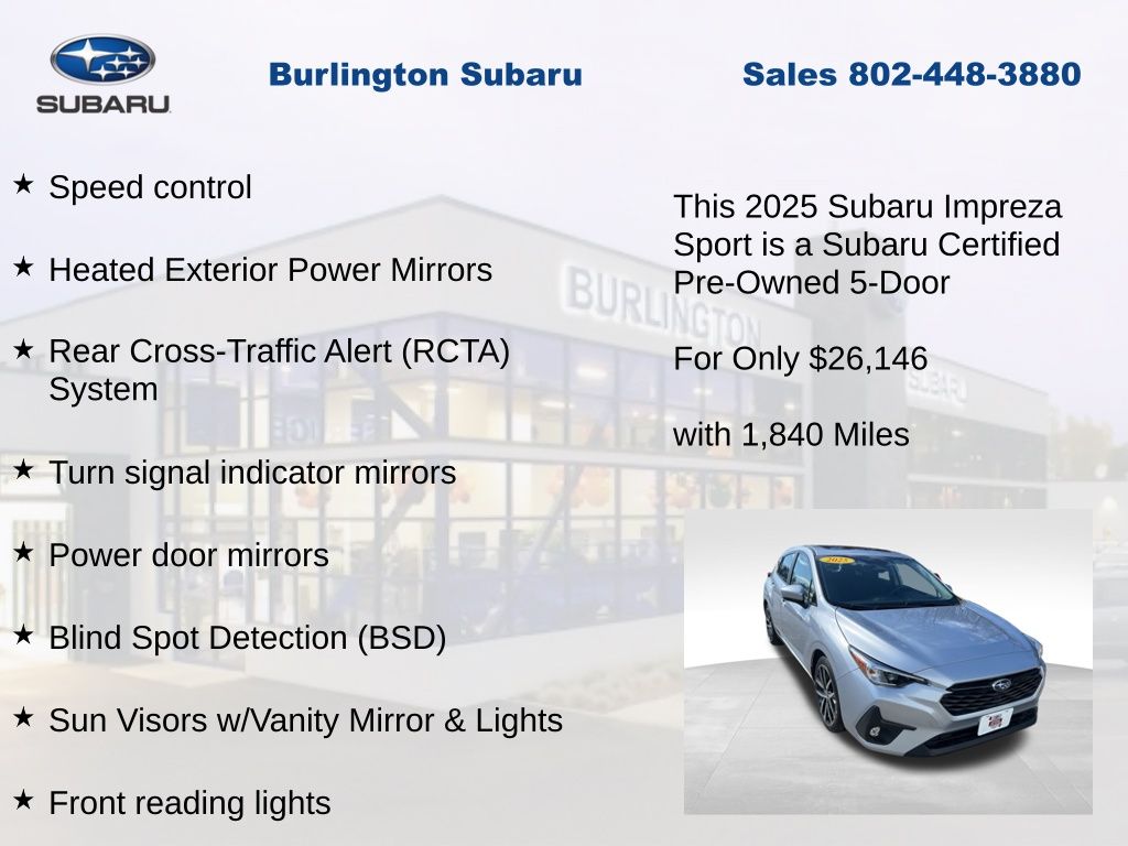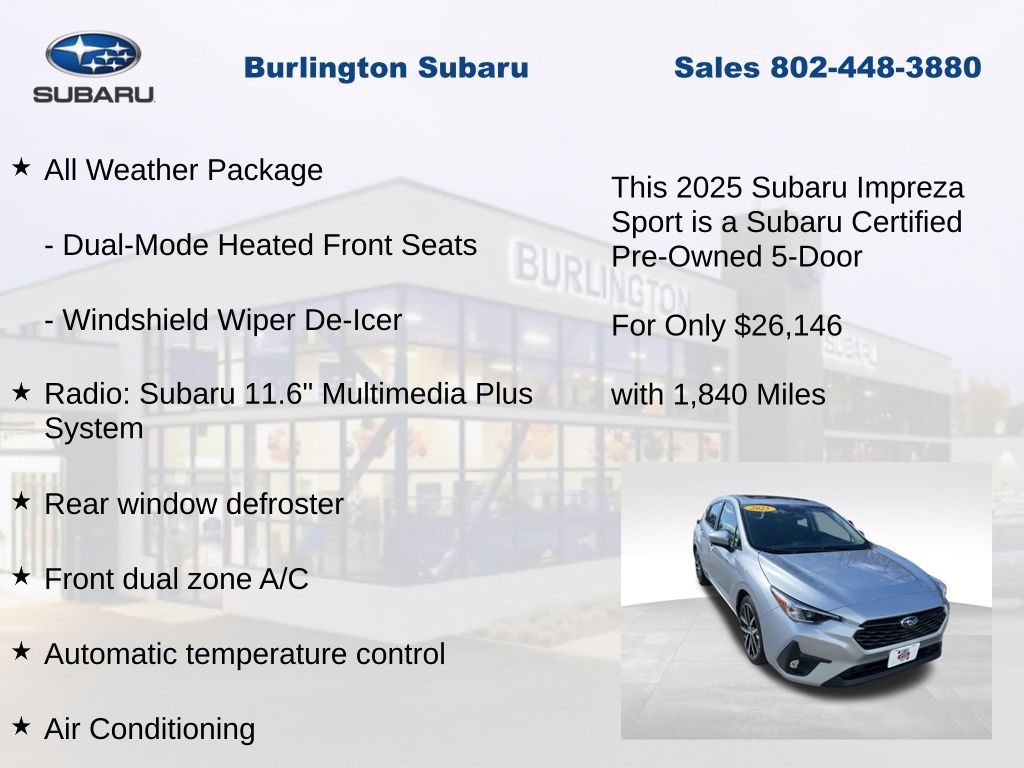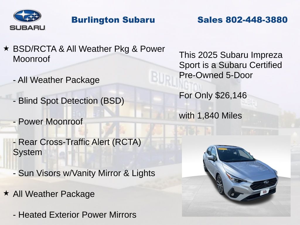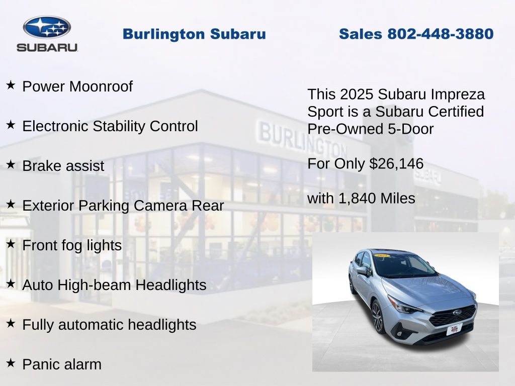 Clean CARFAX. Subaru Impreza Sport 2025 Certified. 4-Wheel Disc Brakes, ABS brakes, Air Conditioning, All Weather Package, Alloy wheels, Anti-whiplash front head restraints, Auto High-beam Headlights, Automatic temperature control, Blind Spot Detection (BSD), Brake assist, BSD/RCTA & All Weather Pkg & Power Moonroof, Driver vanity mirror, Dual front impact airbags, Dual front side impact airbags, Dual-Mode Heated Front Seats, Electronic Stability Control, Emergency communication system, Exterior Parking Camera Rear, Four wheel independent suspension, Front Bucket Seats, Front dual zone A/C, Front fog lights, Front reading lights, Fully automatic headlights, Heated Exterior Power Mirrors, Illuminated entry, Knee airbag, Low tire pressure warning, Occupant sensing airbag, Outside temperature display, Overhead airbag, Panic alarm, Passenger vanity mirror, Power door mirrors, Power Moonroof, Power steering, Power windows, Radio: Subaru 11.6" Multimedia Plus System, Rear Cross-Traffic Alert (RCTA) System, Rear window defroster, Rear window wiper, Remote keyless entry, Speed control, Speed-sensing steering, Split folding rear seat, Steering wheel mounted audio controls, Sun Visors w/Vanity Mirror & Lights, Tachometer, Telescoping steering wheel, Tilt steering wheel, Traction control, Trip computer, Turn signal indicator mirrors, Variably intermittent wipers, Windshield Wiper De-Icer. Odometer is 1821 miles below market average!