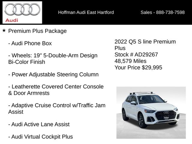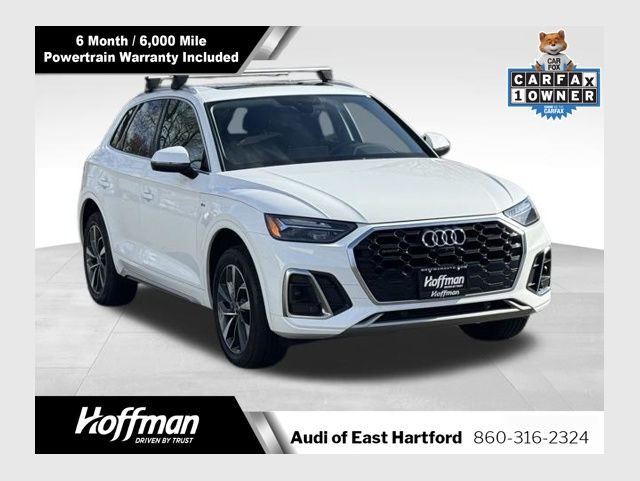 PREMIUM PLUS PKG, PASSES CT STATE INSPECTION, SUNROOF MOONROOF, NAVIGATION, 6 MONTHS/6000 MILES POWERTRAIN WARRANTY, 10 Speakers, 4-Wheel Disc Brakes, 5.302 Axle Ratio, ABS brakes, Adaptive Cruise Control w/Traffic Jam Assist, Air Conditioning, Alloy wheels, AM/FM radio, Audi Active Lane Assist, Audi Advanced Key, Audi Phone Box, Audi Virtual Cockpit Plus, Auto High-beam Headlights, Auto-Dimming Power Folding Exterior Mirrors, Auto-dimming Rear-View mirror, Automatic temperature control, Brake assist, Bumpers: body-color, Compass, Convenience Package, Delay-off headlights, Driver door bin, Driver Seat Memory, Driver vanity mirror, Dual front impact airbags, Dual front side impact airbags, Electronic Stability Control, Emergency communication system: Audi connect CARE, Exterior Parking Camera Rear, Four wheel independent suspension, Front anti-roll bar, Front Bucket Seats, Front Center Armrest, Front dual zone A/C, Front fog lights, Front reading lights, Garage door transmitter: HomeLink, Genuine wood console insert, Genuine wood dashboard insert, Genuine wood door panel insert, Hands-On Detection Steering Wheel, Heated 8-Way Power Front Bucket Seats, Heated door mirrors, Heated front seats, Heated Steering Wheel, Illuminated entry, Leather Seating Surfaces, Leather Shift Knob, Leatherette Covered Center Console & Door Armrests, Low tire pressure warning, Occupant sensing airbag, Outside temperature display, Overhead airbag, Overhead console, Panic alarm, Panoramic Sunroof, Passenger door bin, Passenger vanity mirror, Power Adjustable Steering Column, Power door mirrors, Power driver seat, Power Liftgate, Power passenger seat, Power steering, Power windows, Premium Plus Package, Radio data system, Radio: Audi Sound System, Rain sensing wipers, Rear air conditioning, Rear anti-roll bar, Rear fog lights, Rear reading lights, Rear seat center armrest, Rear window defroster, Rear window wiper, Remote keyless entry, Roof rack, Security system, SiriusXM All Access Service, Speed control, Speed-sensing steering, Speed-Sensitive Wipers, Split folding rear seat, Spoiler, Steering wheel mounted audio controls, Tachometer, Telescoping steering wheel, Tilt steering wheel, Top View Camera System, Traction control, Trip computer, Turn signal indicator mirrors, Variably intermittent wipers, Wheels: 18" 5-Arm-Star Design, Wheels: 19" 5-Double-Arm Design Bi-Color Finish. CARFAX One-Owner. Glacier White Metallic 2022 Audi Q5 45 S line Premium quattro quattro 7-Speed Automatic S tronic 2.0L Turbocharged