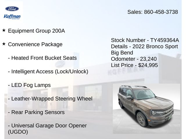 Bronco Sport Big Bend, Smoke Metallic, 3.80 Axle Ratio, 4-Wheel Disc Brakes, 6 Speakers, ABS brakes, Air Conditioning, AM/FM radio: SiriusXM, AM/FM Stereo, Auto High-beam Headlights, Automatic temperature control, Brake assist, Compass, Convenience Package, Delay-off headlights, Driver door bin, Driver vanity mirror, Dual front impact airbags, Dual front side impact airbags, Electronic Stability Control, Emergency communication system: SYNC 3 911 Assist, Equipment Group 200A, Four wheel independent suspension, Front anti-roll bar, Front Bucket Seats, Front Center Armrest, Front Driver & Passenger Seatback Zipper Pockets, Fully automatic headlights, Heated Front Bucket Seats, Intelligent Access (Lock/Unlock), Knee airbag, Leather-Wrapped Steering Wheel, LED Fog Lamps, Low tire pressure warning, Occupant sensing airbag, Outside temperature display, Overhead airbag, Overhead console, Panic alarm, Passenger door bin, Passenger vanity mirror, Power door mirrors, Power steering, Power windows, Radio data system, Rear anti-roll bar, Rear Parking Sensors, Rear reading lights, Rear seat center armrest, Rear window defroster, Rear window wiper, Remote keyless entry, Rubberized Second Row Seat Backs, Security system, SiriusXM Radio, Speed-sensing steering, Speed-Sensitive Wipers, Steering wheel mounted audio controls, SYNC 3 Communications & Entertainment System, SYNC 3/Apple CarPlay/Android Auto, Tachometer, Telescoping steering wheel, Tilt steering wheel, Traction control, Trip computer, Unique Cloth Front Bucket Seats, Universal Garage Door Opener (UGDO), Variably intermittent wipers, Wheels: 17" Carbonized Gray-Painted Aluminum, Wireless Charging Pad.