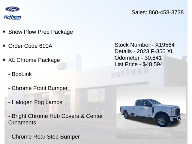 F-350 SuperDuty XL, Power Stroke 6.7L V8 DI 32V OHV Turbodiesel, Oxford White, 4 Speakers, 4-Wheel Disc Brakes, 410 Amp Dual Alternators, ABS brakes, Air Conditioning, AM/FM radio, AM/FM Stereo w/MP3 Player, BoxLink, Brake assist, Chrome Front Bumper, Chrome Rear Step Bumper, Compass, Dual front impact airbags, Dual front side impact airbags, Electronic Stability Control, Exterior Parking Camera Rear, Front & Rear Wheel Well Liners (Pre-Installed), Front anti-roll bar, Front License Plate Bracket, Front reading lights, Fully automatic headlights, Halogen Fog Lamps, HD Vinyl 40/20/40 Split Bench Seat, Heated door mirrors, Illuminated entry, Interior Work Surface, LED Box Lighting, LED Roof Clearance Lights, Low tire pressure warning, Order Code 610A, Outside temperature display, Overhead airbag, Overhead console, Panic alarm, Passenger cancellable airbag, Passenger vanity mirror, Platform Running Boards, Power door mirrors, Power steering, Power windows, Power-Sliding Rear-Window w/Defrost, Privacy Glass, Rapid-Heat Supplemental Cab Heater, Rear step bumper, Remote keyless entry, Remote Start System, Snow Plow Prep Package, Speed control, Split folding rear seat, Steering wheel mounted audio controls, SYNC 4, Tachometer, Tailgate Step & Handle, Telescoping steering wheel, Tilt steering wheel, Trip computer, Turn signal indicator mirrors, Upfitter Switches (6), Variably intermittent wipers, XL Chrome Package.