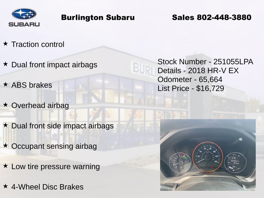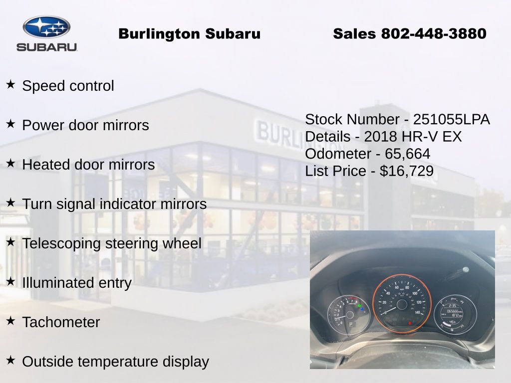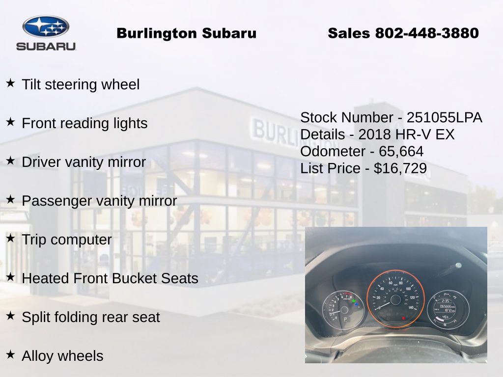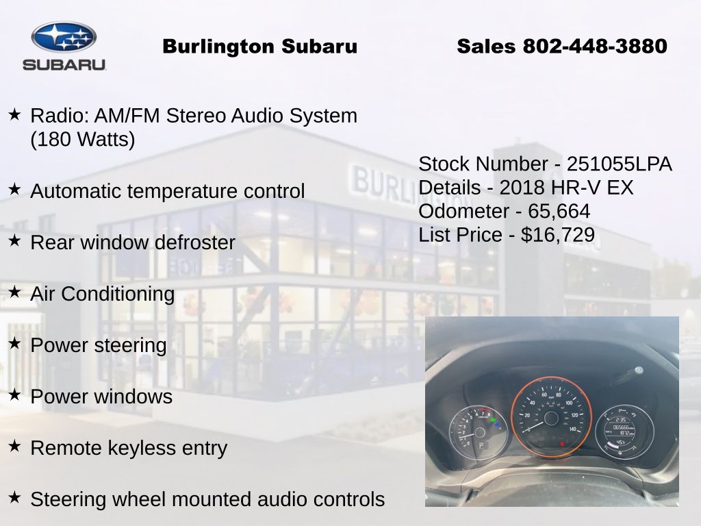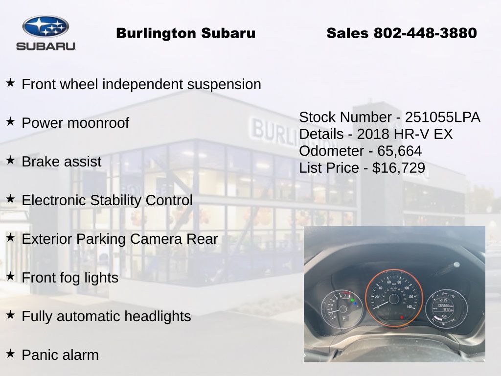 Clean CARFAX. Honda HR-V EX 2018 4-Wheel Disc Brakes, ABS brakes, Air Conditioning, Alloy wheels, Automatic temperature control, Brake assist, Driver vanity mirror, Dual front impact airbags, Dual front side impact airbags, Electronic Stability Control, Exterior Parking Camera Rear, Front fog lights, Front reading lights, Front wheel independent suspension, Fully automatic headlights, Heated door mirrors, Heated Front Bucket Seats, Illuminated entry, Low tire pressure warning, Occupant sensing airbag, Outside temperature display, Overhead airbag, Panic alarm, Passenger vanity mirror, Power door mirrors, Power moonroof, Power steering, Power windows, Radio: AM/FM Stereo Audio System (180 Watts), Rear window defroster, Rear window wiper, Remote keyless entry, Speed control, Split folding rear seat, Steering wheel mounted audio controls, Tachometer, Telescoping steering wheel, Tilt steering wheel, Traction control, Trip computer, Turn signal indicator mirrors, Variably intermittent wipers. Odometer is 18980 miles below market average!