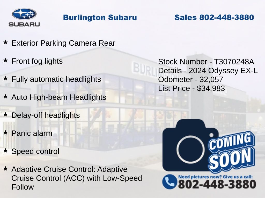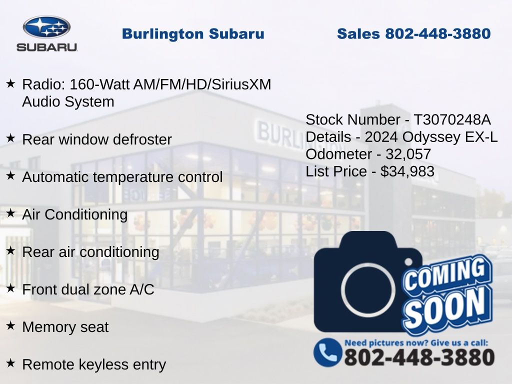 CARFAX One-Owner. Honda Odyssey EX-L 2024 3rd row seats: split-bench, 4-Wheel Disc Brakes, A/V remote: CabinControl, ABS brakes, Adaptive Cruise Control: Adaptive Cruise Control (ACC) with Low-Speed Follow, Air Conditioning, Alloy wheels, Anti-whiplash front head restraints, Apple CarPlay/Android Auto, Auto High-beam Headlights, Auto-dimming Rear-View mirror, Automatic temperature control, Blind Spot Information (BSI) System warning, Brake assist, Delay-off headlights, Driver vanity mirror, Dual front impact airbags, Dual front side impact airbags, Electronic Stability Control, Exterior Parking Camera Rear, Four wheel independent suspension, Front dual zone A/C, Front fog lights, Front reading lights, Fully automatic headlights, Garage door transmitter: HomeLink, Heated door mirrors, Heated Front Bucket Seats, Illuminated entry, Knee airbag, Lane departure: Lane Keeping Assist System (LKAS) active, Leather Seat Trim, Leather steering wheel, Low tire pressure warning, Memory seat, Occupant sensing airbag, Outside temperature display, Overhead airbag, Panic alarm, Passenger vanity mirror, Power door mirrors, Power driver seat, Power Liftgate, Power moonroof, Power passenger seat, Power steering, Power windows, Radio: 160-Watt AM/FM/HD/SiriusXM Audio System, Rear air conditioning, Rear anti-roll bar, Rear reading lights, Rear window defroster, Rear window wiper, Reclining 3rd row seat, Remote keyless entry, Speed control, Speed-sensing steering, Speed-Sensitive Wipers, Split folding rear seat, Steering wheel mounted audio controls, Tachometer, Telescoping steering wheel, Tilt steering wheel, Traction control, Trip computer, Turn signal indicator mirrors. Odometer is 3168 miles below market average!