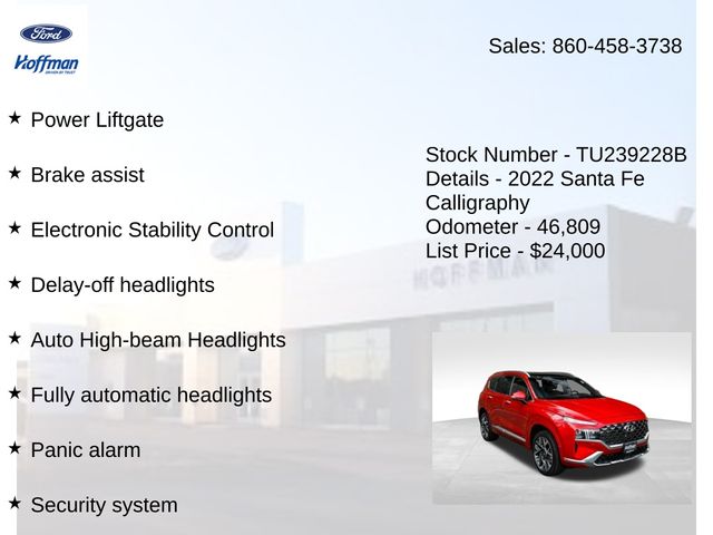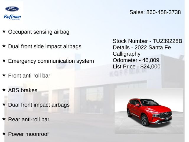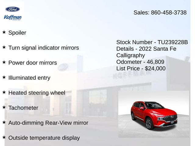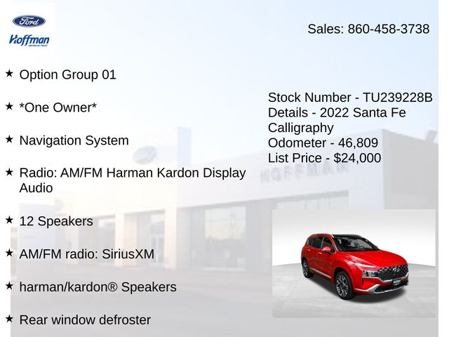 *One Owner*, Santa Fe Calligraphy, AWD, Calypso Red, 12 Speakers, 4-Wheel Disc Brakes, ABS brakes, Air Conditioning, AM/FM radio: SiriusXM, Apple CarPlay & Android Auto, Auto High-beam Headlights, Auto-dimming Rear-View mirror, Automatic temperature control, Axle Ratio: 3.316, Brake assist, Delay-off headlights, Driver door bin, Driver vanity mirror, Dual front impact airbags, Dual front side impact airbags, Electronic Stability Control, Emergency communication system, Four wheel independent suspension, Front anti-roll bar, Front Bucket Seats, Front Center Armrest, Front dual zone A/C, Front reading lights, Fully automatic headlights, Garage door transmitter: HomeLink, harman/kardon® Speakers, Heads-Up Display, Heated & Ventilated Front Bucket Seats, Heated front seats, Heated rear seats, Heated steering wheel, Illuminated entry, Leather steering wheel, Low tire pressure warning, Memory seat, Navigation System, Occupant sensing airbag, Option Group 01, Outside temperature display, Overhead airbag, Overhead console, Panic alarm, Power door mirrors, Power driver seat, Power Liftgate, Power moonroof, Power passenger seat, Power steering, Power windows, Quilted Premium Nappa Leather Seat Trim, Radio: AM/FM Harman Kardon Display Audio, Rain sensing wipers, Rear anti-roll bar, Rear seat center armrest, Rear window defroster, Rear window wiper, Remote keyless entry, Security system, Speed-sensing steering, Split folding rear seat, Spoiler, Steering wheel mounted audio controls, Tachometer, Telescoping steering wheel, Tilt steering wheel, Traction control, Trip computer, Turn signal indicator mirrors, Variably intermittent wipers, Ventilated front seats, Wheels: 20" x 8.0J Alloy.