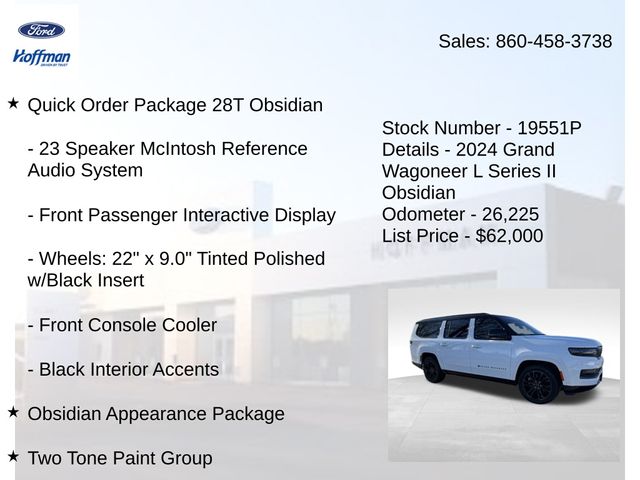 *Sunroof*, *Heated Seats*, *3rd Row*, Grand Wagoneer L Series II Obsidian, Bright White Clearcoat, 19 Speakers, 23 Speaker McIntosh Reference Audio System, 3rd row seats: bench, 4-Wheel Disc Brakes, ABS brakes, Adjustable pedals, Adjustable Roof Rail Crossbars, Air Conditioning, AM/FM radio: SiriusXM with 360L, Anti-whiplash front head restraints, Apple CarPlay/Android Auto, Audio memory, Auto High-beam Headlights, Auto-dimming door mirrors, Auto-dimming Rear-View mirror, Auto-leveling suspension, Automatic temperature control, Black Interior Accents, Black Roof, Brake assist, Bumpers: body-color, Compass, Delay-off headlights, Driver door bin, Driver vanity mirror, Driver's Seat Mounted Armrest, Dual front impact airbags, Dual front side impact airbags, Electronic Stability Control, Emergency communication system, Four wheel independent suspension, Front anti-roll bar, Front Bucket Seats, Front Console Cooler, Front dual zone A/C, Front fog lights, Front Passenger Interactive Display, Front reading lights, Fully automatic headlights, Garage door transmitter, Genuine wood console insert, Genuine wood dashboard insert, Genuine wood door panel insert, Gloss Black Upper & Lower DLO Molding, Heads-Up Display, Heated door mirrors, Heated front seats, Heated rear seats, Illuminated entry, Knee airbag, Leather steering wheel, Leather Trimmed Bucket Seats, Low tire pressure warning, Memory seat, Normal Duty Suspension, Obsidian Appearance Package, Occupant sensing airbag, Outside temperature display, Overhead airbag, Overhead console, Panic alarm, Passenger door bin, Passenger seat mounted armrest, Passenger vanity mirror, Pedal memory, Piano Black Exterior Accents, Power adjustable front head restraints, Power door mirrors, Power driver seat, Power Liftgate, Power moonroof, Power passenger seat, Power steering, Power windows, Quick Order Package 28T Obsidian, Radio data system, Radio: Uconnect 5 Nav w/12.0" Display, Rain sensing wipers, Rear air conditioning, Rear anti-roll bar, Rear dual zone A/C, Rear reading lights, Rear seat center armrest, Rear window defroster, Rear window wiper, Rearview Autodim Digital Display Mirror, Reclining 3rd row seat, Remote keyless entry, Security system, Speed control, Speed-sensing steering, Speed-Sensitive Wipers, Split folding rear seat, Steering wheel memory, Steering wheel mounted audio controls, Tachometer, Telescoping steering wheel, Tilt steering wheel, Traction control, Trip computer, Turn signal indicator mirrors, Two Tone Paint Group, Variably intermittent wipers, Ventilated front seats, Ventilated Rear Seats, Voltmeter, Wheels: 22" x 9.0" Tinted Polished w/Black Insert.