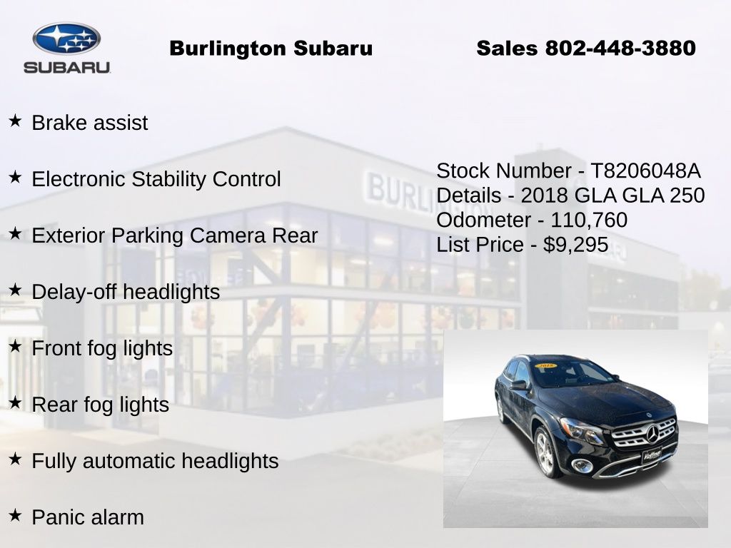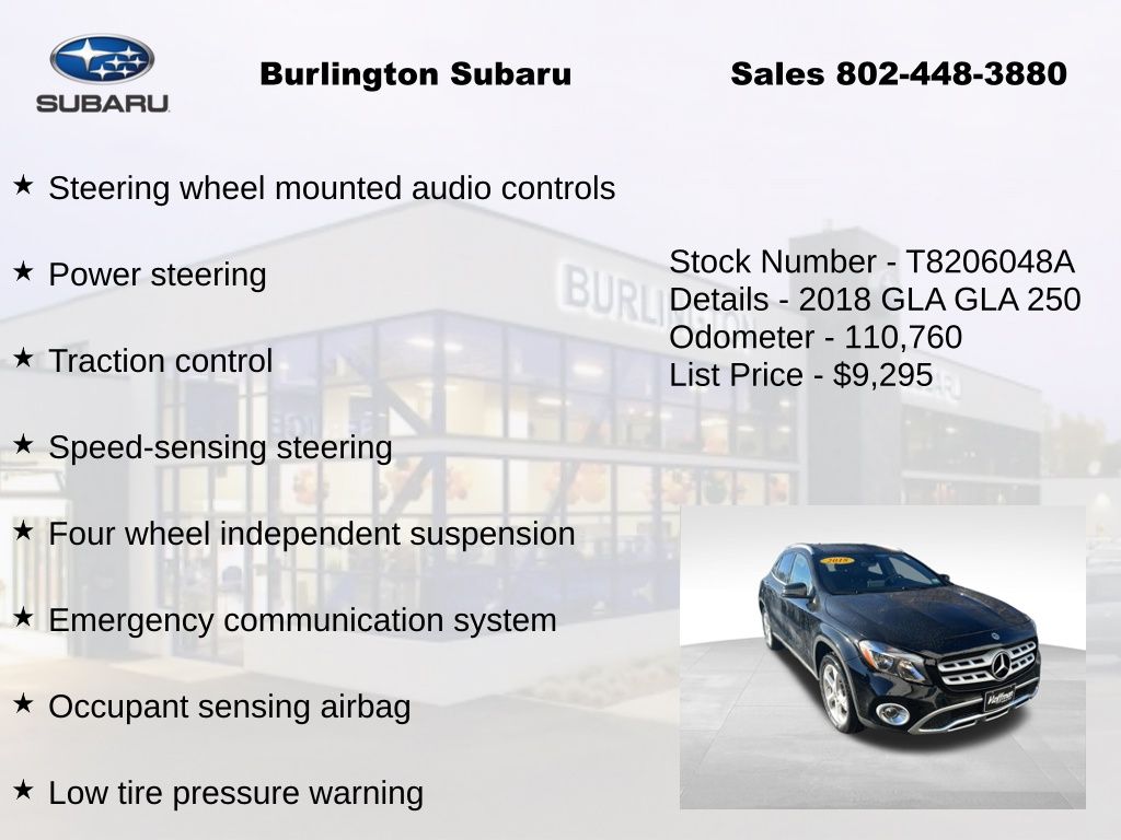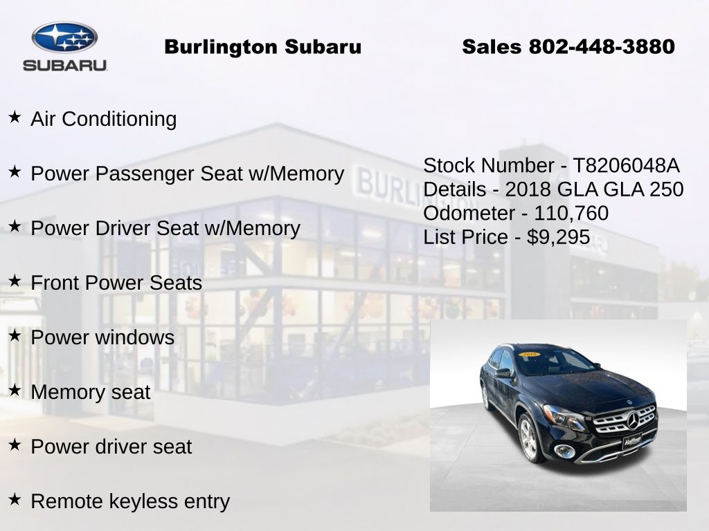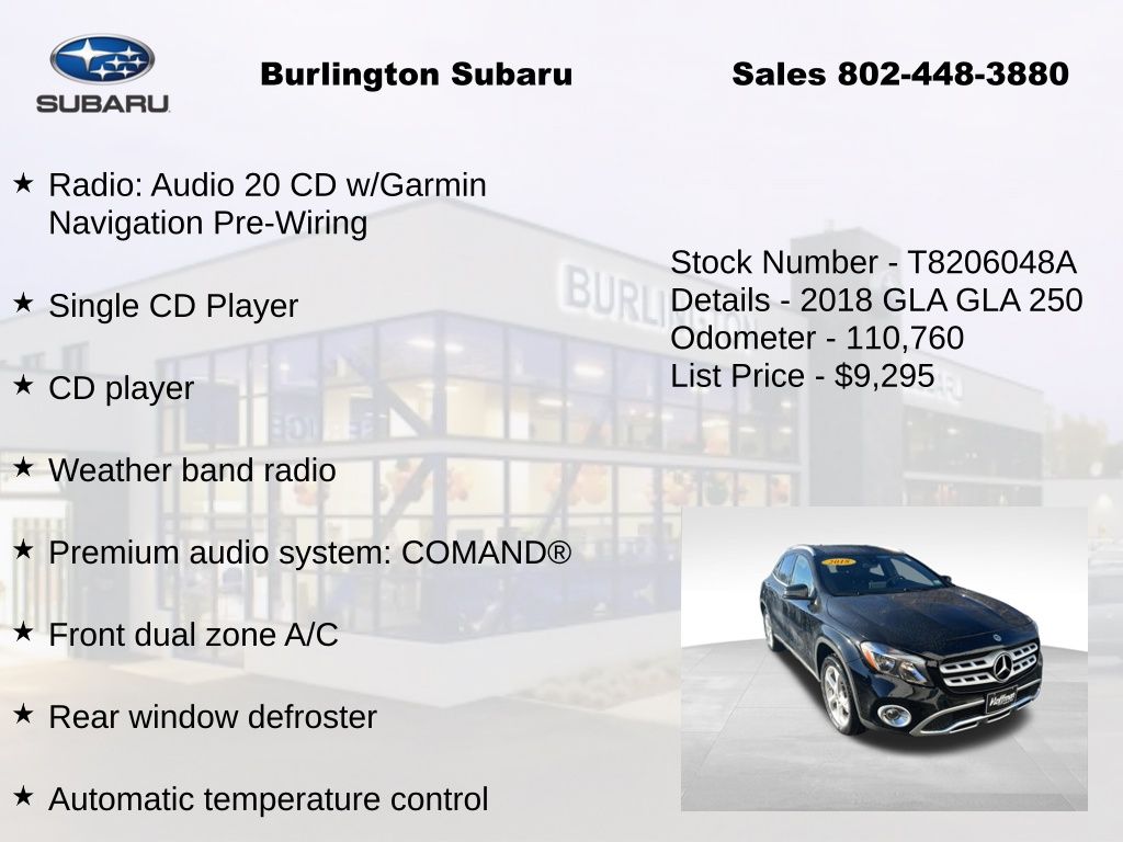 CARFAX One-Owner. Mercedes-Benz GLA GLA 250 2018 4-Wheel Disc Brakes, 8" Color Display Upgrade, ABS brakes, Air Conditioning, Alloy wheels, Automatic temperature control, Brake assist, CD player, Child-Seat-Sensing Airbag, Delay-off headlights, Driver vanity mirror, Dual front impact airbags, Dual front side impact airbags, Electronic Stability Control, Emergency communication system, Exterior Parking Camera Rear, Four wheel independent suspension, Front dual zone A/C, Front fog lights, Front Power Seats, Front reading lights, Fully automatic headlights, Heated door mirrors, Illuminated entry, Knee airbag, Low tire pressure warning, Memory seat, Occupant sensing airbag, Outside temperature display, Overhead airbag, Overhead console, Panic alarm, Passenger vanity mirror, Power door mirrors, Power driver seat, Power Driver Seat w/Memory, Power Liftgate, Power passenger seat, Power Passenger Seat w/Memory, Power steering, Power windows, Premium audio system: COMAND®, Radio: Audio 20 CD w/Garmin Navigation Pre-Wiring, Rain sensing wipers, Rear fog lights, Rear reading lights, Rear window defroster, Remote keyless entry, Single CD Player, Speed control, Speed-sensing steering, Split folding rear seat, Steering wheel mounted audio controls, Tachometer, Telescoping steering wheel, Tilt steering wheel, Traction control, Trip computer, Turn signal indicator mirrors, Variably intermittent wipers, Weather band radio.