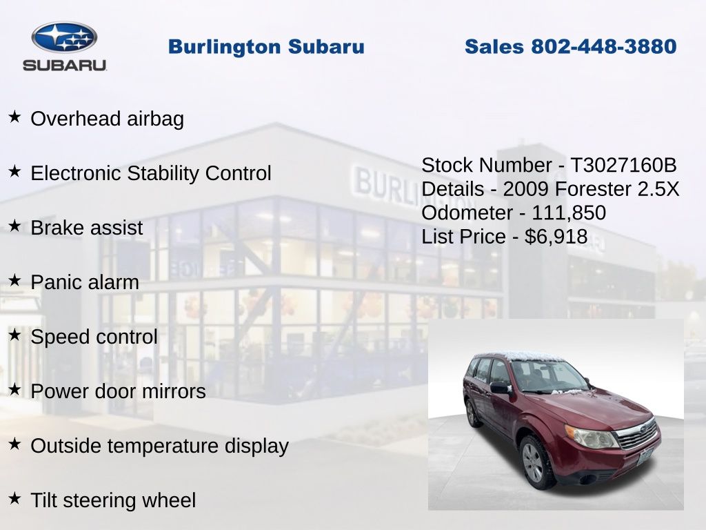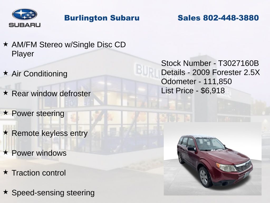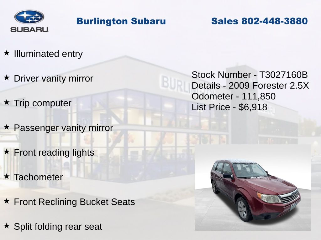Subaru Forester 2.5X 2009 4-Wheel Disc Brakes, ABS brakes, Air Conditioning, AM/FM Stereo w/Single Disc CD Player, Anti-whiplash front head restraints, Brake assist, Driver vanity mirror, Dual front impact airbags, Dual front side impact airbags, Electronic Stability Control, Four wheel independent suspension, Front reading lights, Front Reclining Bucket Seats, Illuminated entry, Low tire pressure warning, Occupant sensing airbag, Outside temperature display, Overhead airbag, Panic alarm, Passenger vanity mirror, Power door mirrors, Power steering, Power windows, Rear window defroster, Rear window wiper, Remote keyless entry, Speed control, Speed-sensing steering, Split folding rear seat, Tachometer, Tilt steering wheel, Traction control, Trip computer, Variably intermittent wipers. Odometer is 16421 miles below market average!