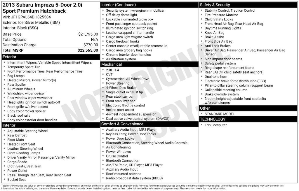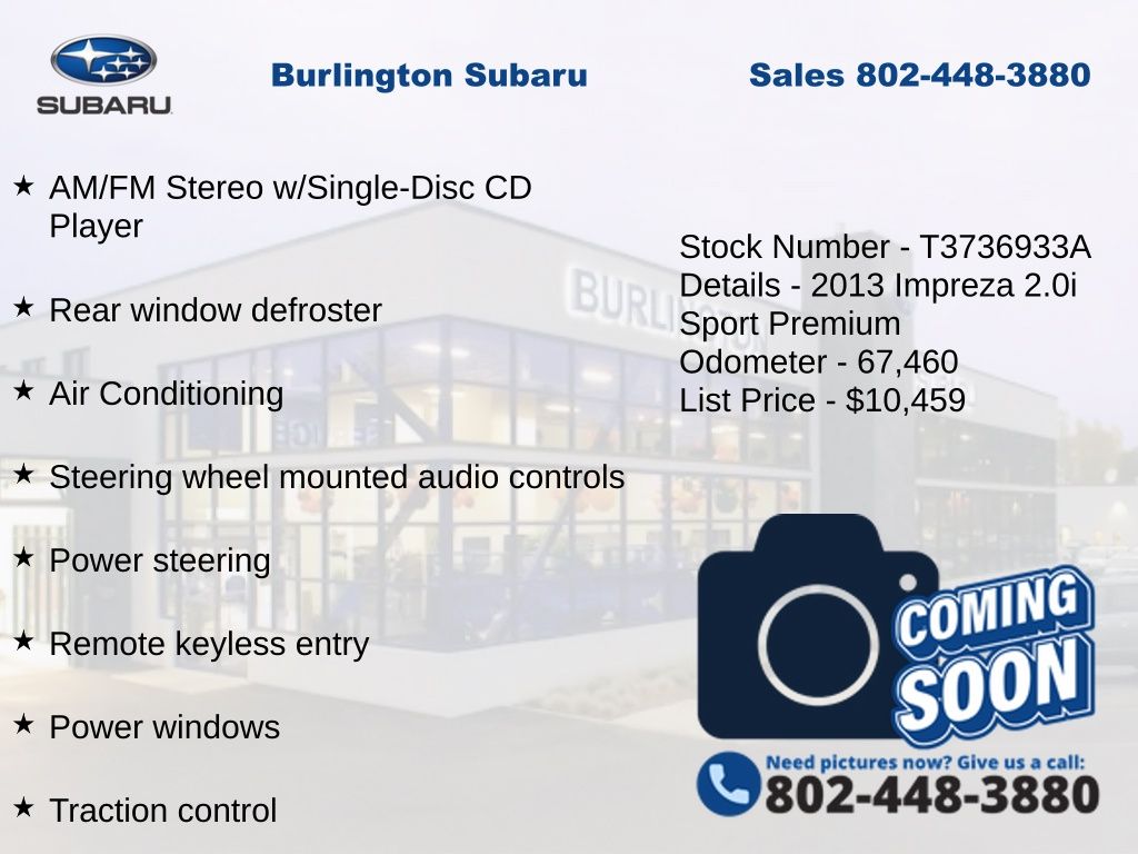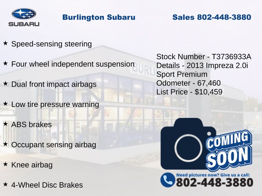 Subaru Impreza 2.0i Sport Premium 2013 4-Wheel Disc Brakes, ABS brakes, Air Conditioning, Alloy wheels, AM/FM Stereo w/Single-Disc CD Player, Brake assist, Driver vanity mirror, Dual front impact airbags, Dual front side impact airbags, Electronic Stability Control, Four wheel independent suspension, Front Bucket Seats, Front fog lights, Front reading lights, Heated door mirrors, Heated Reclining Front Bucket Seats, Illuminated entry, Knee airbag, Leather Shift Knob, Leather steering wheel, Low tire pressure warning, Occupant sensing airbag, Outside temperature display, Overhead airbag, Panic alarm, Passenger vanity mirror, Power door mirrors, Power steering, Power windows, Rear window defroster, Rear window wiper, Remote keyless entry, Speed control, Speed-sensing steering, Split folding rear seat, Steering wheel mounted audio controls, Tachometer, Telescoping steering wheel, Tilt steering wheel, Traction control, Trip computer, Variably intermittent wipers. Odometer is 48333 miles below market average!
