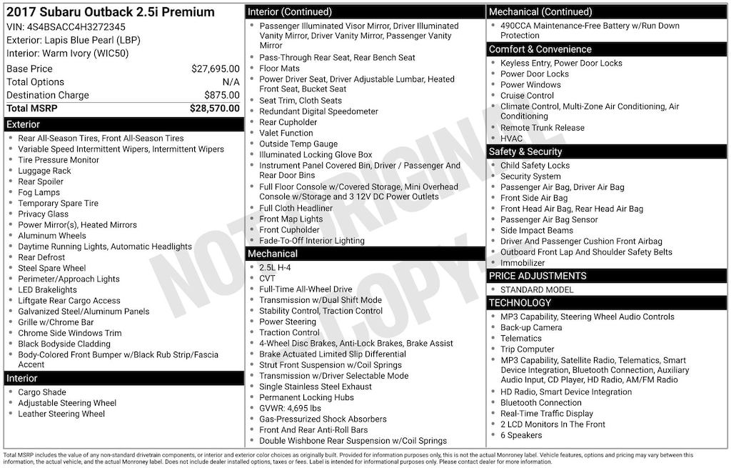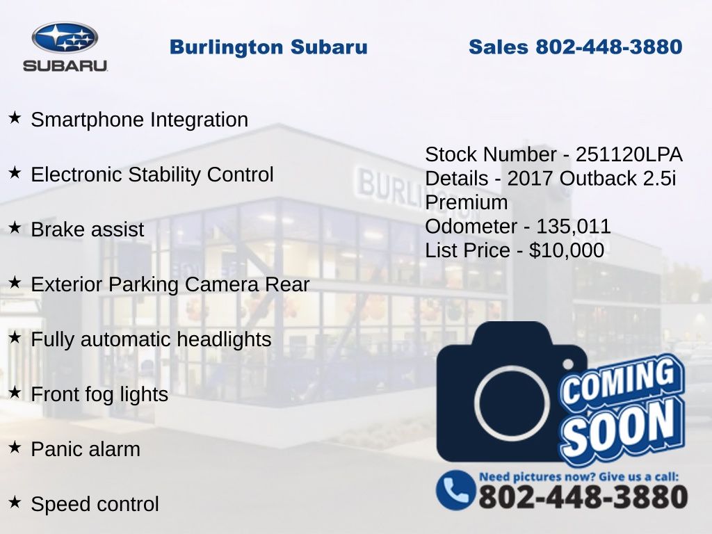 Clean CARFAX. Subaru Outback 2.5i Premium 2017 4-Wheel Disc Brakes, ABS brakes, Aha, Air Conditioning, Alloy wheels, AM/FM radio: SiriusXM, Anti-whiplash front head restraints, Automatic temperature control, Brake assist, CD player, Driver vanity mirror, Dual front impact airbags, Dual front side impact airbags, Electronic Stability Control, Emergency communication system, Exterior Parking Camera Rear, Four wheel independent suspension, Front dual zone A/C, Front fog lights, Front reading lights, Fully automatic headlights, Heated door mirrors, Heated Reclining Front Bucket Seats, Illuminated entry, Leather Shift Knob, Low tire pressure warning, Occupant sensing airbag, Outside temperature display, Overhead airbag, Panic alarm, Passenger vanity mirror, Power door mirrors, Power driver seat, Power steering, Power windows, Rear window defroster, Rear window wiper, Remote keyless entry, Smartphone Integration, Speed control, Speed-sensing steering, Split folding rear seat, Steering wheel mounted audio controls, Steering-Wheel Paddle-Shift Control Switches, Tachometer, Telescoping steering wheel, Tilt steering wheel, Traction control, Trip computer, Variably intermittent wipers, Vehicle Information Display.