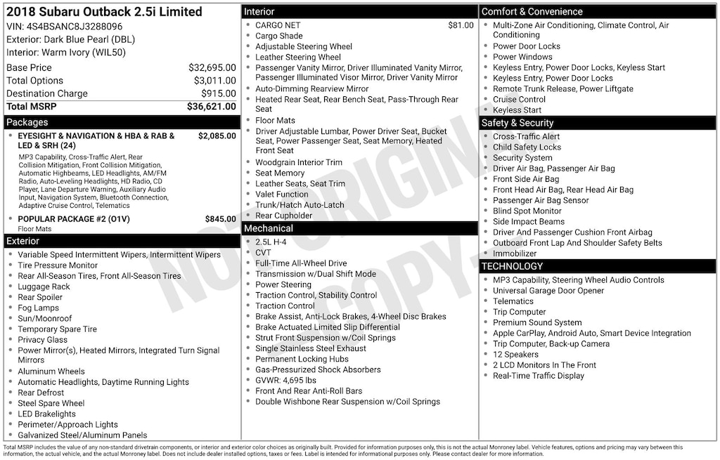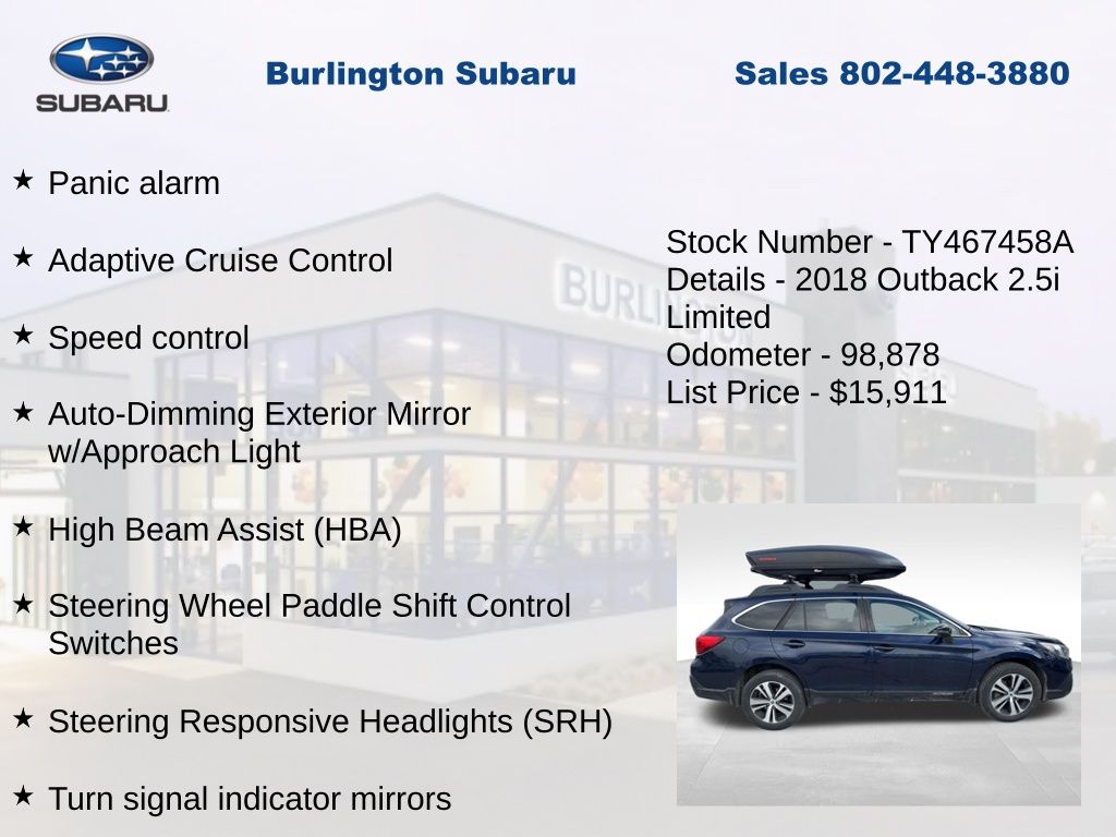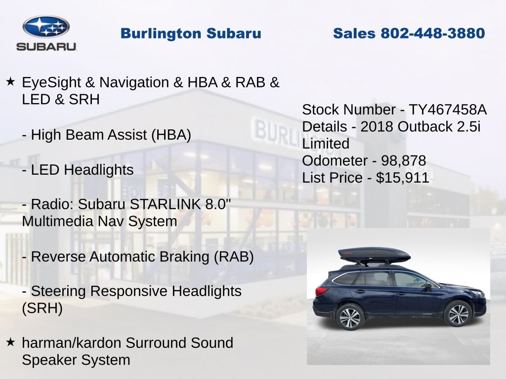 Clean CARFAX. Subaru Outback 2.5i 2018 4-Wheel Disc Brakes, ABS brakes, Adaptive Cruise Control, Air Conditioning, Alloy wheels, Anti-whiplash front head restraints, Apple CarPlay/Android Auto, Auto-Dimming Exterior Mirror w/Approach Light, Auto-dimming Rear-View mirror, Automatic temperature control, Brake assist, Compass, Driver vanity mirror, Dual front impact airbags, Dual front side impact airbags, Electronic Stability Control, Emergency communication system: STARLINK, Exterior Parking Camera Rear, EyeSight & Navigation & HBA & RAB & LED & SRH, Four wheel independent suspension, Front dual zone A/C, Front fog lights, Front reading lights, Fully automatic headlights, Garage door transmitter, harman/kardon Surround Sound Speaker System, Heated door mirrors, Heated front seats, Heated Reclining Front Bucket Seats, High Beam Assist (HBA), Illuminated entry, Lane Departure Warning & Sway Warning, Leather Shift Knob, LED Headlights, Low tire pressure warning, Map & Dome Lights LED Upgrade, Memory seat, Occupant sensing airbag, Outside temperature display, Overhead airbag, Panic alarm, Passenger vanity mirror, Perforated Leather-Trimmed Upholstery, Power door mirrors, Power driver seat, Power Liftgate, Power moonroof, Power passenger seat, Power steering, Power windows, Pre-Collision Braking System, Radio: Subaru STARLINK 8.0" Multimedia Nav System, Rear Seatback Protector, Rear window defroster, Rear window wiper, Remote keyless entry, Reverse Automatic Braking (RAB), Smartphone Integration, Speed control, Speed-sensing steering, Split folding rear seat, Steering Responsive Headlights (SRH), Steering wheel mounted audio controls, Steering Wheel Paddle Shift Control Switches, Tachometer, Telescoping steering wheel, Tilt steering wheel, Traction control, Trip computer, Turn signal indicator mirrors, Variably intermittent wipers, Vehicle Information Display.