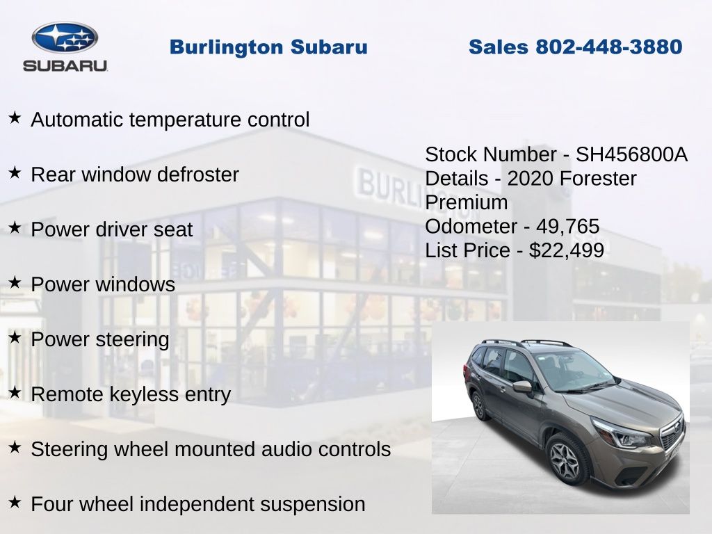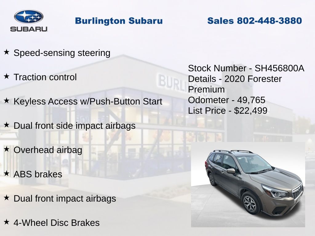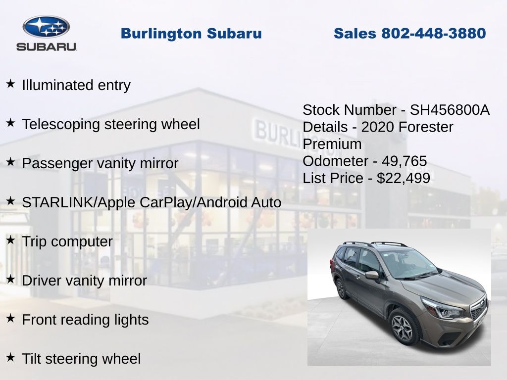 CARFAX One-Owner. Clean CARFAX. Subaru Forester Premium 2020 4-Wheel Disc Brakes, ABS brakes, Air Conditioning, Alloy wheels, Automatic temperature control, Blind Spot Detection w/Rear Cross Traffic Alert, Brake assist, CD player, Driver Assist Technology Pkg & Keyless Access, Driver vanity mirror, Driver's Seatback Pocket, Dual front impact airbags, Dual front side impact airbags, Electronic Stability Control, Emergency communication system: STARLINK Safety and Security (Subscription Required), Exterior Parking Camera Rear, Four wheel independent suspension, Front reading lights, Fully automatic headlights, Gloss Black HVAC Control Panel Bezel, Heated door mirrors, Heated Front Bucket Seats, Illuminated entry, Keyless Access w/Push-Button Start, Knee airbag, Low tire pressure warning, Occupant sensing airbag, Outside temperature display, Overhead airbag, Panic alarm, Passenger vanity mirror, Power door mirrors, Power driver seat, Power moonroof: Panoramic, Power steering, Power windows, Rear Dual USB Charge Ports, Rear window defroster, Rear window wiper, Remote keyless entry, Speed control, Speed-sensing steering, Split folding rear seat, STARLINK/Apple CarPlay/Android Auto, Steering wheel mounted audio controls, Tachometer, Telescoping steering wheel, Tilt steering wheel, Traction control, Trip computer, Variably intermittent wipers. Odometer is 24694 miles below market average!