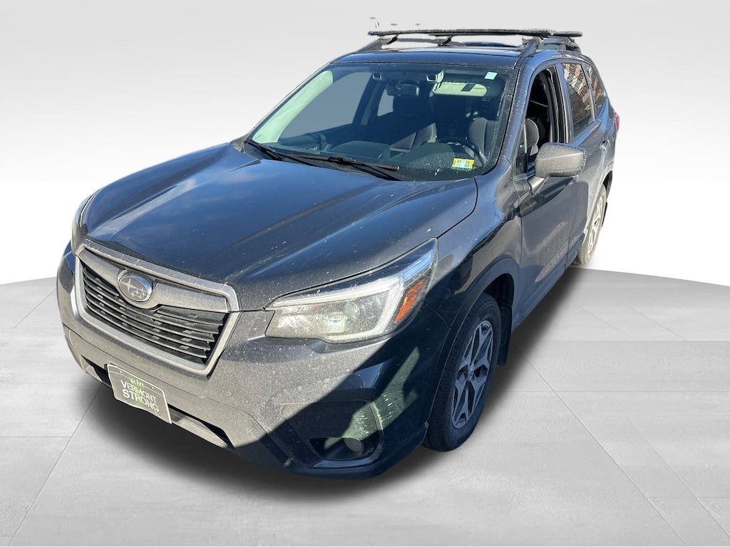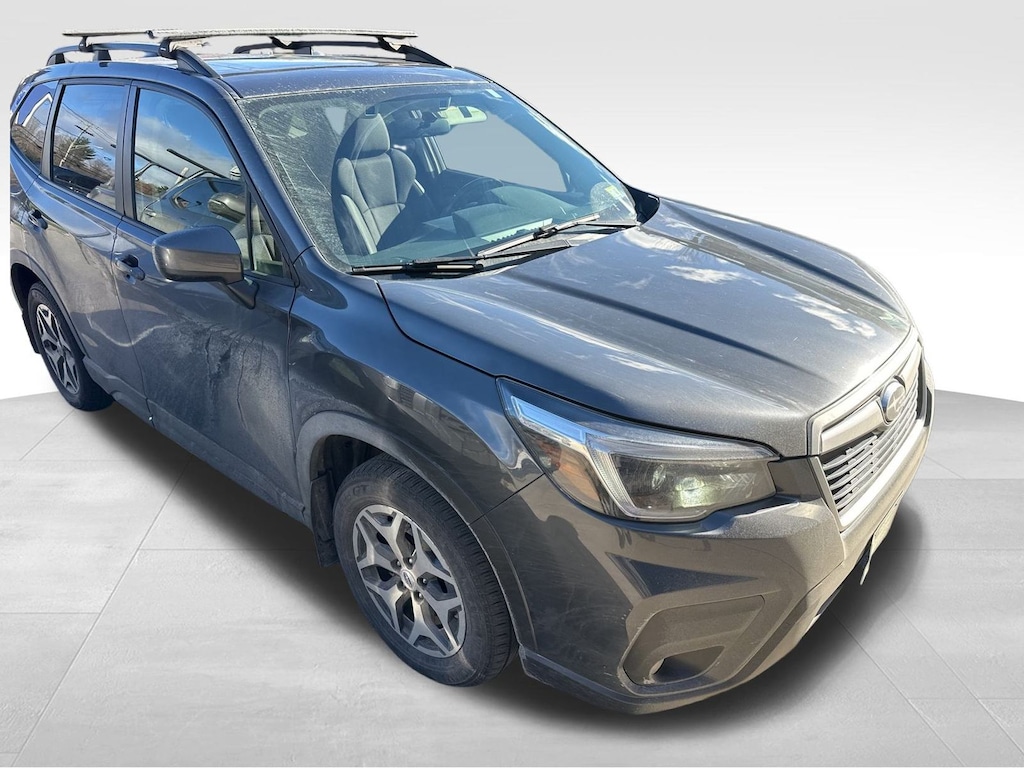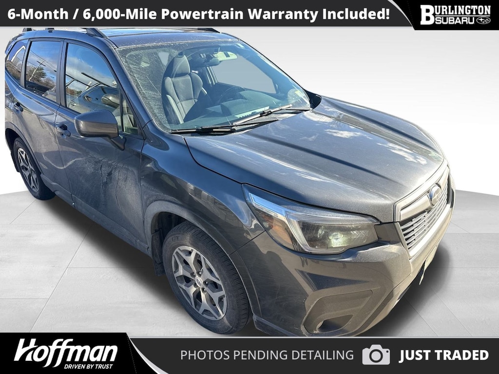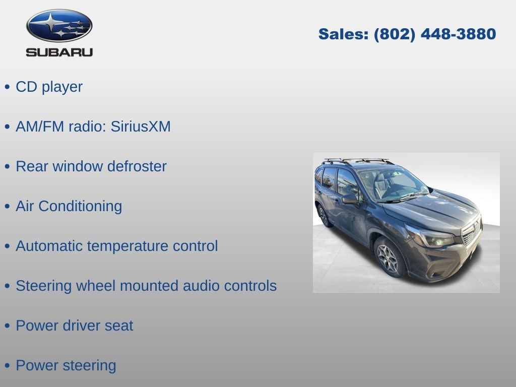 CARFAX One-Owner. Subaru Forester Premium 2021 4-Wheel Disc Brakes, ABS brakes, Air Conditioning, Alloy wheels, AM/FM radio: SiriusXM, Auto High-beam Headlights, Automatic temperature control, Brake assist, CD player, Driver vanity mirror, Dual front impact airbags, Dual front side impact airbags, Electronic Stability Control, Emergency communication system: STARLINK Safety and Security (Subscription Required), Exterior Parking Camera Rear, Four wheel independent suspension, Front fog lights, Front reading lights, Fully automatic headlights, Heated door mirrors, Heated Front Bucket Seats, Illuminated entry, Knee airbag, Low tire pressure warning, Occupant sensing airbag, Outside temperature display, Overhead airbag, Overhead console, Panic alarm, Passenger vanity mirror, Power door mirrors, Power driver seat, Power moonroof: Panoramic, Power steering, Power windows, Rear anti-roll bar, Rear window defroster, Rear window wiper, Remote keyless entry, Speed-sensing steering, Split folding rear seat, STARLINK/Apple CarPlay/Android Auto, Steering wheel mounted audio controls, Tachometer, Telescoping steering wheel, Tilt steering wheel, Traction control, Trip computer, Variably intermittent wipers.