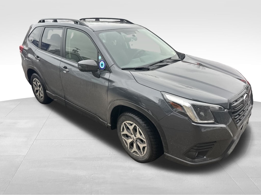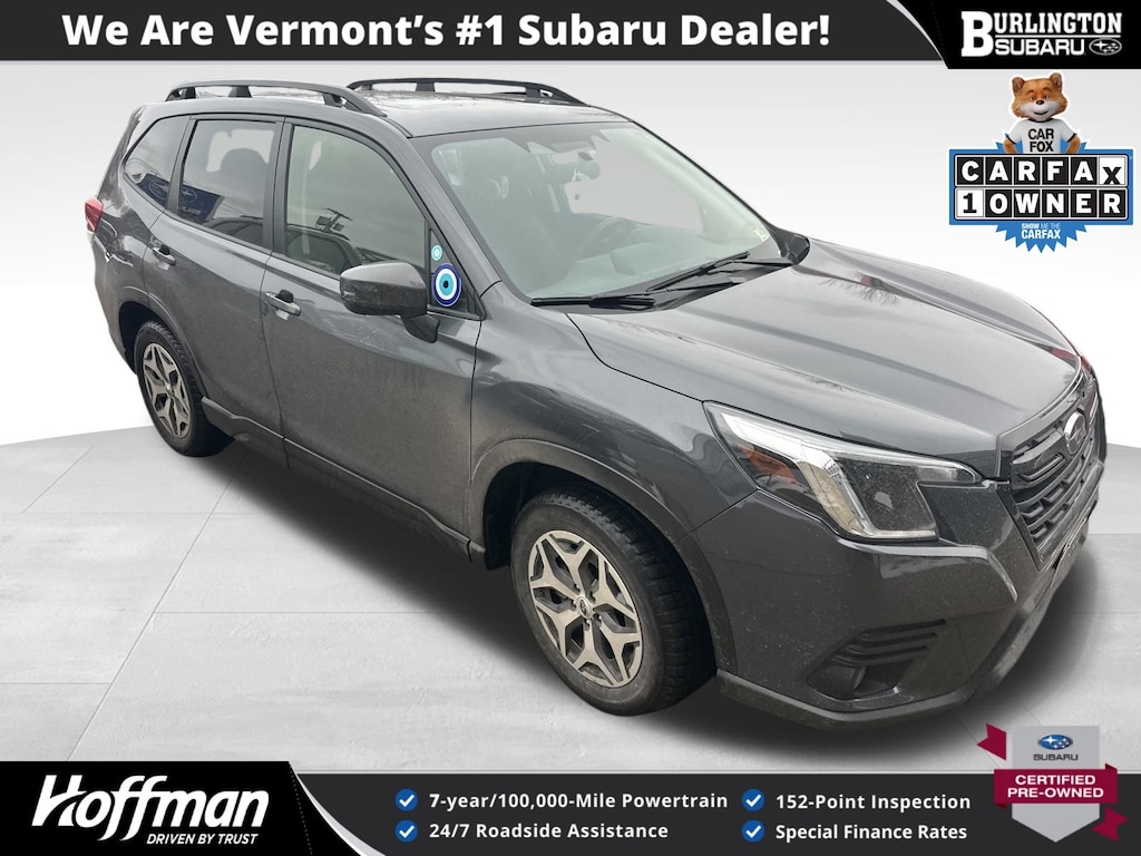 CARFAX One-Owner. Clean CARFAX. Subaru Forester Premium 2023 Certified. 4-Wheel Disc Brakes, ABS brakes, Air Conditioning, Alloy wheels, Anti-whiplash front head restraints, Auto High-beam Headlights, Automatic temperature control, Blind Spot Detection w/RCTA & Power Rear Gate, Blind-Spot Detection (BSD), Brake assist, CD player, Driver vanity mirror, Driver's Seatback Divided Pocket, Dual front impact airbags, Dual front side impact airbags, Dual USB Charge Ports, Electronic Stability Control, Emergency communication system: STARLINK Safety and Security (Subscription Required), Exterior Parking Camera Rear, EyeSight System, Four wheel independent suspension, Front fog lights, Front reading lights, Fully automatic headlights, Heated door mirrors, Heated Front Bucket Seats, Illuminated entry, Knee airbag, Low tire pressure warning, Multi-Function High Grade Display, Occupant sensing airbag, Outside temperature display, Overhead airbag, Panic alarm, Passenger vanity mirror, Power door mirrors, Power driver seat, Power moonroof: Panoramic, Power Rear Gate, Power steering, Power windows, Radio: Subaru Starlink 6.5" Multimedia Plus System, Rear window defroster, Rear window wiper, Remote keyless entry, Speed control, Speed-sensing steering, Split folding rear seat, STARLINK/Apple CarPlay/Android Auto, Steering wheel mounted audio controls, Tachometer, Telescoping steering wheel, Tilt steering wheel, Traction control, Trip computer, Variably intermittent wipers. Odometer is 22401 miles below market average!