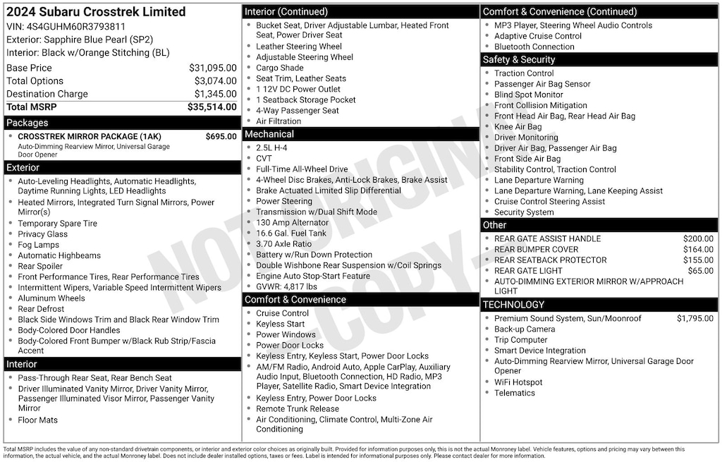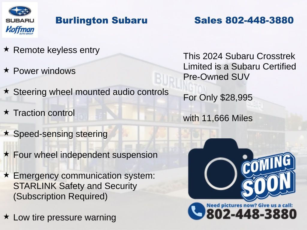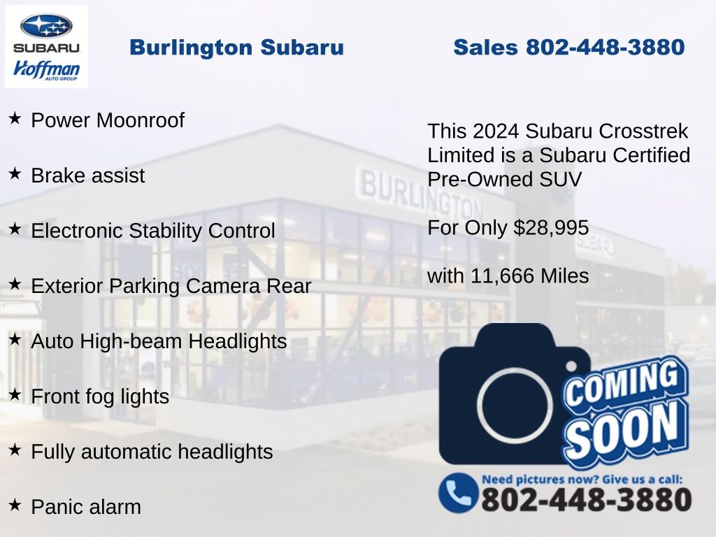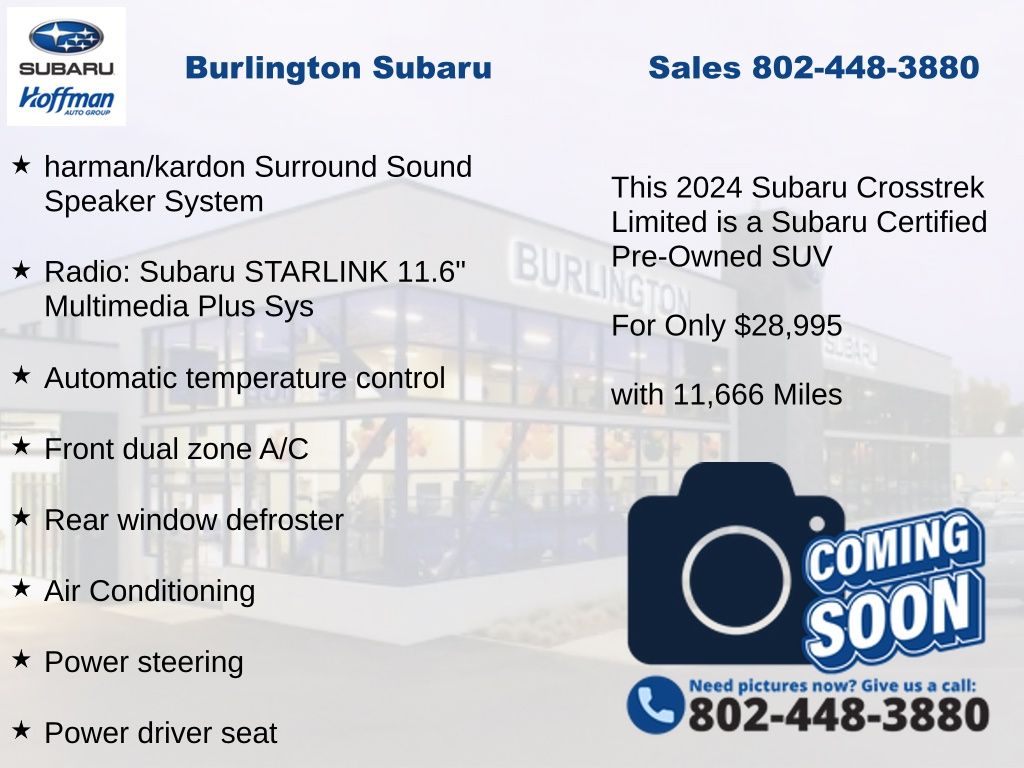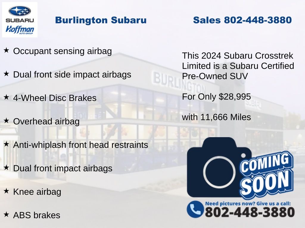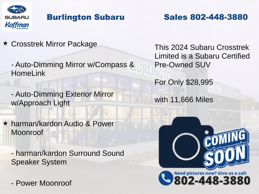 CARFAX One-Owner. Clean CARFAX. Subaru Crosstrek Limited 2024 Certified. 4-Wheel Disc Brakes, ABS brakes, Air Conditioning, Alloy wheels, Anti-whiplash front head restraints, Auto High-beam Headlights, Auto-Dimming Exterior Mirror w/Approach Light, Auto-Dimming Mirror w/Compass & HomeLink, Automatic temperature control, Brake assist, Crosstrek Mirror Package, Driver vanity mirror, Dual front impact airbags, Dual front side impact airbags, Electronic Stability Control, Emergency communication system: STARLINK Safety and Security (Subscription Required), Exterior Parking Camera Rear, Four wheel independent suspension, Front dual zone A/C, Front fog lights, Front reading lights, Fully automatic headlights, harman/kardon Audio & Power Moonroof, harman/kardon Surround Sound Speaker System, Heated door mirrors, Heated Front Bucket Seats, Illuminated entry, Knee airbag, Leather Shift Knob, Leather-Trimmed Upholstery, Low tire pressure warning, Occupant sensing airbag, Outside temperature display, Overhead airbag, Panic alarm, Passenger vanity mirror, Power door mirrors, Power driver seat, Power Moonroof, Power steering, Power windows, Radio: Subaru STARLINK 11.6" Multimedia Plus Sys, Rear Gate Assist Handle, Rear Gate Light, Rear Seatback Protector (DISC), Rear window defroster, Rear window wiper, Remote keyless entry, Speed control, Speed-sensing steering, Split folding rear seat, STARLINK/Apple CarPlay/Android Auto, Steering wheel mounted audio controls, Tachometer, Telescoping steering wheel, Tilt steering wheel, Traction control, Trip computer, Turn signal indicator mirrors, Variably intermittent wipers. Odometer is 10479 miles below market average!