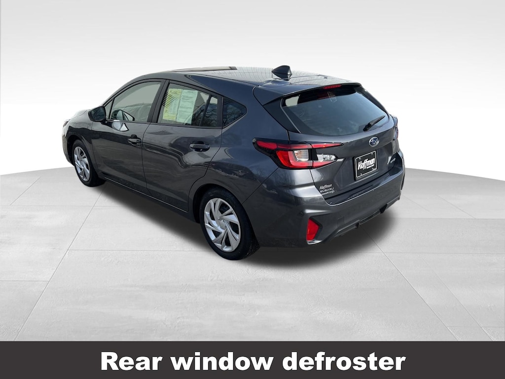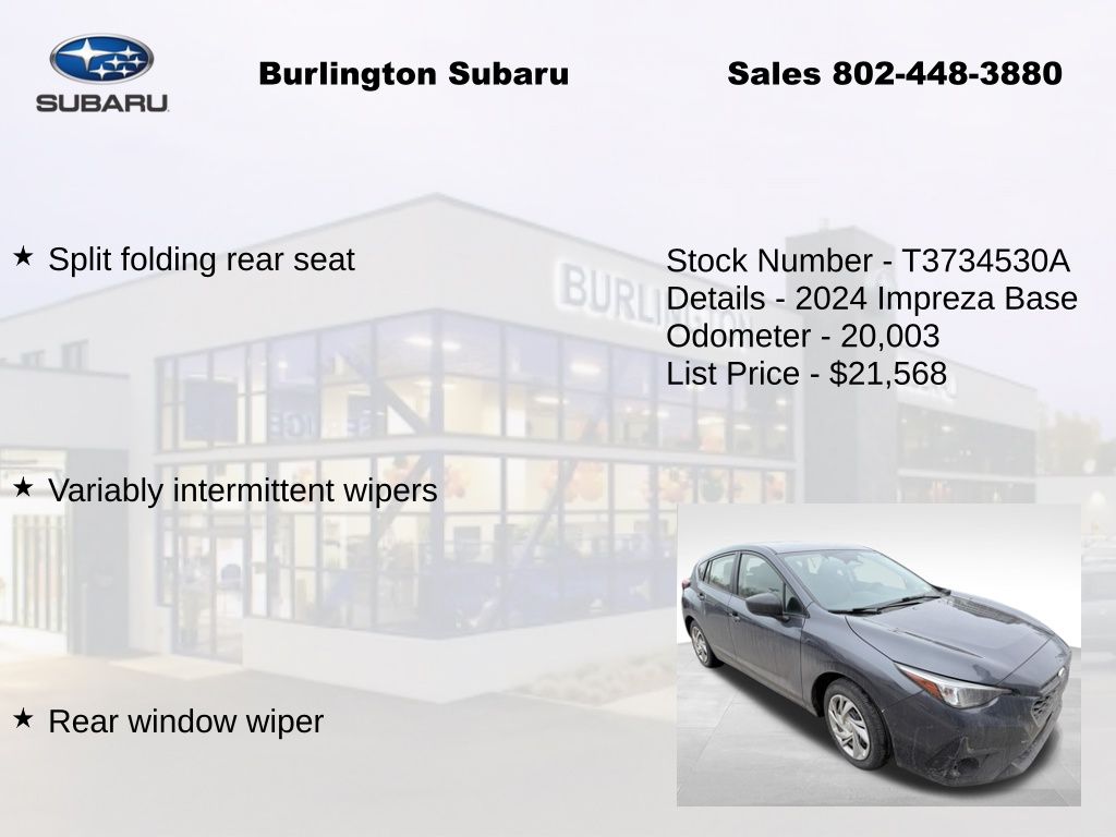 CARFAX One-Owner. Clean CARFAX. Subaru Impreza 2024 4-Wheel Disc Brakes, ABS brakes, Air Conditioning, Anti-whiplash front head restraints, Auto High-beam Headlights, Automatic temperature control, Brake assist, Driver vanity mirror, Dual front impact airbags, Dual front side impact airbags, Electronic Stability Control, Exterior Parking Camera Rear, Four wheel independent suspension, Front Bucket Seats, Front dual zone A/C, Front reading lights, Fully automatic headlights, Illuminated entry, Knee airbag, Low tire pressure warning, Occupant sensing airbag, Outside temperature display, Overhead airbag, Panic alarm, Passenger vanity mirror, Power door mirrors, Power steering, Power windows, Radio: Subaru STARLINK Dual 7.0" Multimedia System, Rear window defroster, Rear window wiper, Remote keyless entry, Speed control, Speed-sensing steering, Split folding rear seat, STARLINK/Apple CarPlay/Android Auto, Steering wheel mounted audio controls, Tachometer, Telescoping steering wheel, Tilt steering wheel, Traction control, Trip computer, Variably intermittent wipers. Odometer is 9061 miles below market average!