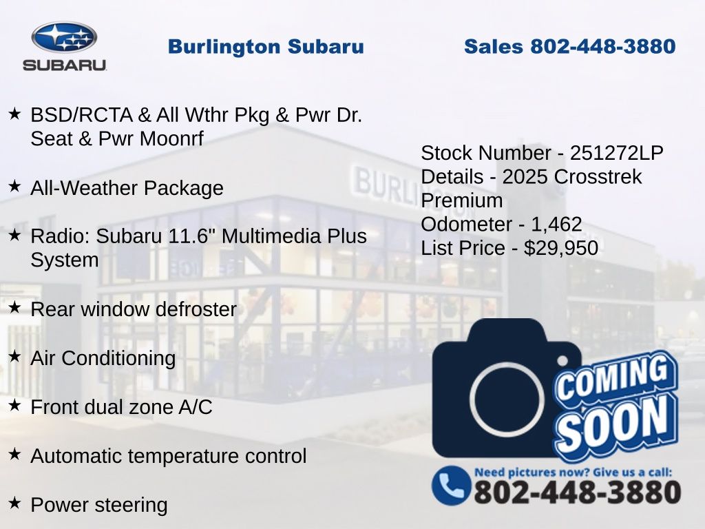 Clean CARFAX. Subaru Crosstrek Premium 2025 10-Way Power Driver's Seat, 4-Wheel Disc Brakes, ABS brakes, Air Conditioning, All-Weather Package, Alloy wheels, Anti-whiplash front head restraints, Auto High-beam Headlights, Automatic temperature control, Blind Spot Detection (BSD), Brake assist, BSD/RCTA & All Wthr Pkg & Pwr Dr. Seat & Pwr Moonrf, Driver vanity mirror, Dual front impact airbags, Dual front side impact airbags, Dual-Mode Heated Front Seats, Electronic Stability Control, Emergency communication system, Exterior Parking Camera Rear, Four wheel independent suspension, Front Bucket Seats, Front dual zone A/C, Front fog lights, Front reading lights, Fully automatic headlights, Heated Power Exterior Mirrors, Illuminated entry, Knee airbag, Low tire pressure warning, Occupant sensing airbag, Outside temperature display, Overhead airbag, Passenger vanity mirror, Power door mirrors, Power Moonroof, Power steering, Power windows, Radio: Subaru 11.6" Multimedia Plus System, Rear Cross-Traffic Alert (RCTA) System, Rear window defroster, Rear window wiper, Remote keyless entry, Security system, Speed control, Speed-sensing steering, Split folding rear seat, Steering wheel mounted audio controls, Tachometer, Telescoping steering wheel, Tilt steering wheel, Traction control, Trip computer, Turn signal indicator mirrors, Variably intermittent wipers, Windshield De-Icer Wipers. Odometer is 2652 miles below market average!