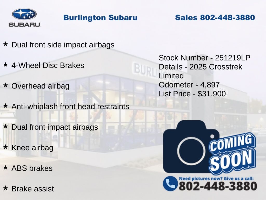 Clean CARFAX. Subaru Crosstrek Limited 2025 4-Wheel Disc Brakes, ABS brakes, Air Conditioning, Alloy wheels, Anti-whiplash front head restraints, Auto High-beam Headlights, Automatic temperature control, Brake assist, Driver vanity mirror, Dual front impact airbags, Dual front side impact airbags, Electronic Stability Control, Emergency communication system, Exterior Parking Camera Rear, Four wheel independent suspension, Front dual zone A/C, Front fog lights, Front reading lights, Fully automatic headlights, Heated door mirrors, Heated Front Bucket Seats, Illuminated entry, Knee airbag, Leather Shift Knob, Leather steering wheel, Leather-Trimmed Upholstery, Low tire pressure warning, Occupant sensing airbag, Outside temperature display, Overhead airbag, Panic alarm, Passenger vanity mirror, Power door mirrors, Power driver seat, Power steering, Power windows, Radio: Subaru 11.6" Multimedia Plus System, Rear window defroster, Rear window wiper, Remote keyless entry, Speed control, Speed-sensing steering, Split folding rear seat, Steering wheel mounted audio controls, Tachometer, Telescoping steering wheel, Tilt steering wheel, Traction control, Trip computer, Turn signal indicator mirrors, Variably intermittent wipers. Odometer is 1230 miles below market average!