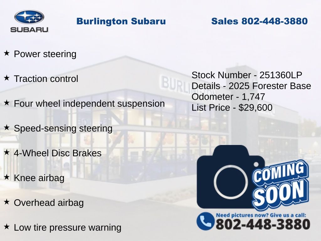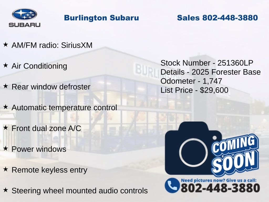 Clean CARFAX. Subaru Forester 2025 4-Wheel Disc Brakes, ABS brakes, Air Conditioning, Alloy wheels, AM/FM radio: SiriusXM, Anti-whiplash front head restraints, Auto High-beam Headlights, Automatic temperature control, Brake assist, Driver vanity mirror, Dual front impact airbags, Dual front side impact airbags, Electronic Stability Control, Exterior Parking Camera Rear, Four wheel independent suspension, Front Bucket Seats, Front dual zone A/C, Front reading lights, Fully automatic headlights, Illuminated entry, Knee airbag, Low tire pressure warning, Occupant sensing airbag, Outside temperature display, Overhead airbag, Panic alarm, Passenger vanity mirror, Power door mirrors, Power steering, Power windows, Rear window defroster, Rear window wiper, Remote keyless entry, Speed control, Speed-sensing steering, Split folding rear seat, Steering wheel mounted audio controls, Tachometer, Telescoping steering wheel, Tilt steering wheel, Traction control, Trip computer, Variably intermittent wipers. Odometer is 3748 miles below market average!