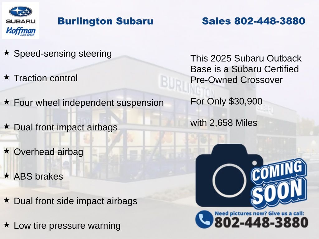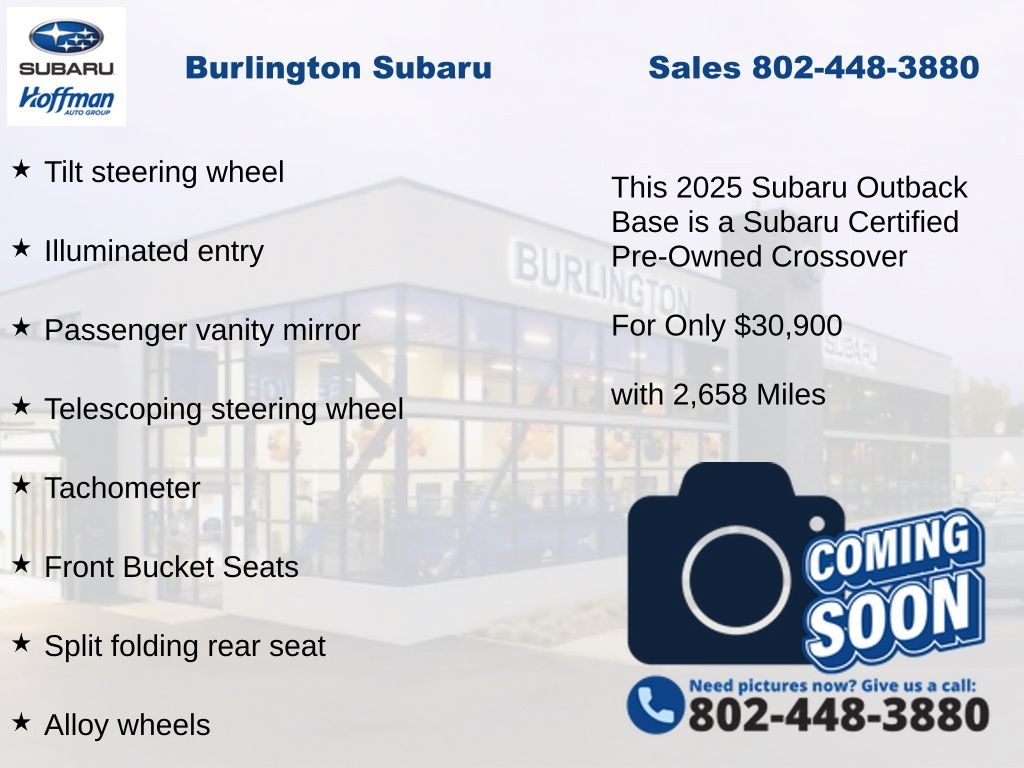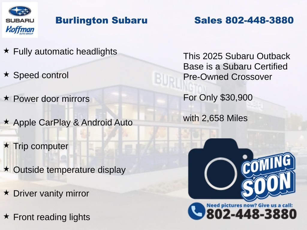 Clean CARFAX. Subaru Outback 2.5i 2025 Certified. 4-Wheel Disc Brakes, ABS brakes, Air Conditioning, Alloy wheels, Apple CarPlay & Android Auto, Auto High-beam Headlights, Automatic temperature control, Brake assist, Driver vanity mirror, Dual front impact airbags, Dual front side impact airbags, Electronic Stability Control, Exterior Parking Camera Rear, Four wheel independent suspension, Front Bucket Seats, Front fog lights, Front reading lights, Fully automatic headlights, Illuminated entry, Knee airbag, Low tire pressure warning, Occupant sensing airbag, Outside temperature display, Overhead airbag, Passenger vanity mirror, Power door mirrors, Power steering, Power windows, Radio: Subaru Dual 7.0" Multimedia System, Rear window defroster, Rear window wiper, Remote keyless entry, Speed control, Speed-sensing steering, Split folding rear seat, Steering wheel mounted audio controls, Tachometer, Telescoping steering wheel, Tilt steering wheel, Traction control, Trip computer. Odometer is 730 miles below market average!