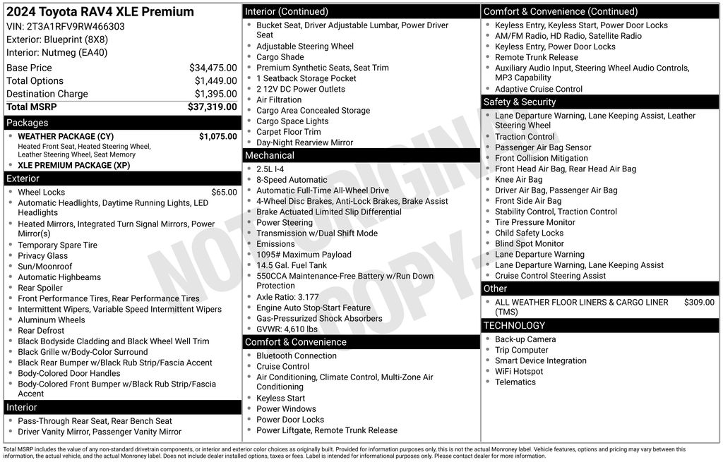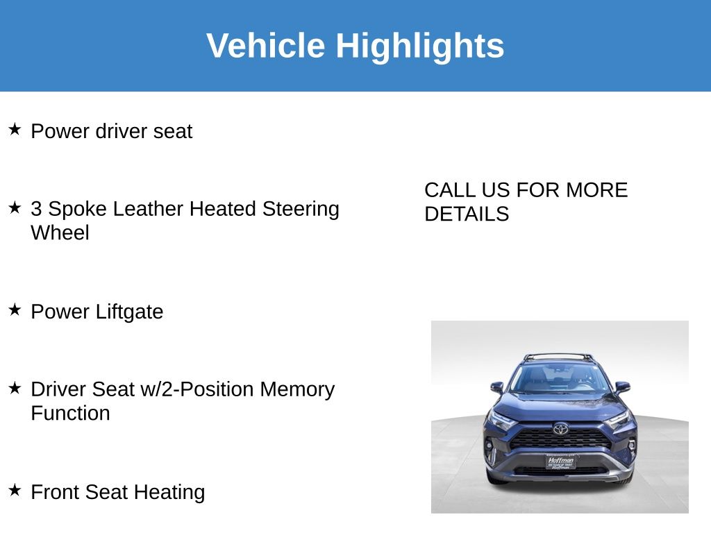 MOONROOF SUNROOF, REAR BACK UP CAMERA, BLUE TOOTH, AWD, Nutmeg Premium Synthetic, 3 Spoke Leather Heated Steering Wheel, Driver Seat w/2-Position Memory Function, Front Seat Heating, Power driver seat, Power Liftgate, Weather Package, XLE Premium Package. 2024 Toyota RAV4 XLE Premium Clean CARFAX. CARFAX One-Owner. 27/33 City/Highway MPG 27/33 City/Highway MPG Odometer is 1588 miles below market average!